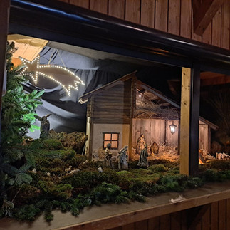 Die Fotos zeigen die Krippe, die direkt neben dem Eingang zum Sportheim steht. Sie wurde mit handwerklichen Geschick aber auch mit viel Herzblut von dem Vorstandsteam der DJK gebaut.